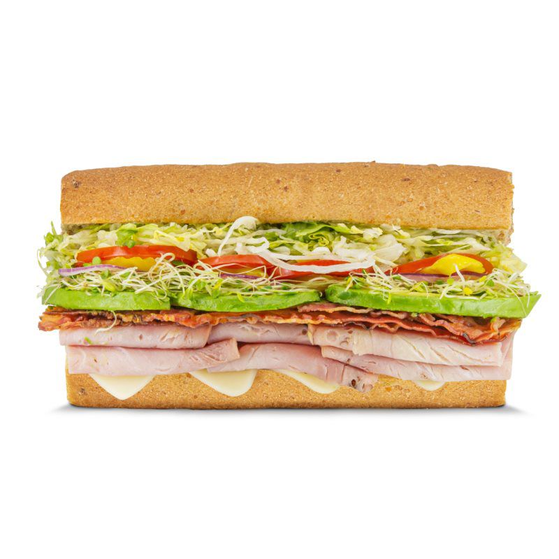 Flame grilled chicken breast, avocado, English cucumbers, Jack cheese, grape tomatoes, baby dill pickles, red onion and sprouts
